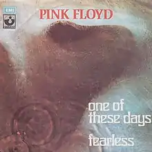 "One of These Days" is the opening track from Pink Floyd's 1971 album Meddle.[4][5] The composition is instrumental except for the spoken line from drummer Nick Mason, "One of these days, I'm going to cut you into little pieces." It features double-tracked bass guitars played by David Gilmour and Roger Waters,[5] with each bass hard panned into one channel of stereo, but one bass sound is quite muted and dull. According to Gilmour, this is because that particular instrument had old strings on it, and the roadie they had sent to get new strings for it wandered off to see his girlfriend instead.[6]