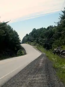 The road east of Carnarvon to Haliburton incorporates portions of the Peterson Road to West Guilford, and the North West Road thereafter. These two colonization roads were assumed by the DHO in 1956 as Highway 530 and a portion of Highway 519.[17][11] That year also saw the creation of Highway 121 between Fenelon Falls and Tory Hill via Minden and Haliburton.[11] To the east, the discovery of uranium deposits near Cardiff in 1952 resulted in a large mining boom for the Bancroft area. As a result, the DHO began constructing a new highway in 1956 which would connect the mines with Highway 28.[18] This new road would open as Highway 109 in 1958, connecting Highway 500 northeast of Tory Hill with Highway 28 at Paudash; the road was paved in 1961.[19] On March 1, 1964, several highways were renumbered in the Bancroft area. Highway 121 was extended from Tory Hill to Paudash via Highway 500 and Highway 109 as a result of this renumbering.[20]