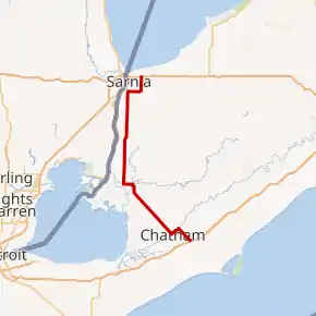 King's Highway 40, commonly referred to as Highway 40, is a provincially maintained highway in the southwestern portion of the Canadian province of Ontario. The 91.4-kilometre (56.8 mi) route links Chatham and Sarnia via Wallaceburg, following close to the St. Clair River. The southern terminus is at Highway 401 south of Chatham, while the northern terminus is at Highway 402 in Sarnia. The portion of Highway 40 between Highway 401 and north of Wallaceburg is within the municipality of Chatham-Kent, while the portion north of there is within Lambton County.