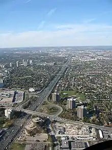 Officially, the Ministry of Transportation of Ontario (MTO) jurisdiction over the freeway begins as the opposing directions of travel diverge south of the Highway 401 interchange.[note 1] Northbound, two lanes from the DVP are joined by a third from the eastbound collectors of Highway 401. These narrow to two lanes before merging with a single lane from westbound Highway 401 immediately south of Sheppard Avenue. An additional two lanes from eastbound Highway 401 converge and form a separate carriageway with no access to Sheppard.[4] Southbound, the freeway is divided into two carriageways, both of which provide access to the DVP. The outer carriageway also provides access from Sheppard and to Highway 401, including the westbound express lanes, while the inner carriageway is intended for DVP-bound traffic. The HOV lane also provides access to westbound Highway 401 via a dedicated tunnel, which passes beneath the other southbound lanes.[5] To the east of Highway 404 is the Consumers Road office park. To the west and north of Sheppard Avenue is Fairview Mall, which has its own connection with the southbound lanes attached to the Sheppard interchange.[2]