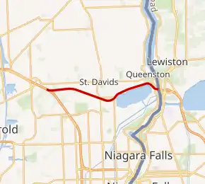 Highway 405 serves to connect the northern end of I-190 in New York at the Lewiston–Queenston Bridge with the QEW, and therefore it follows a somewhat direct path between the two.[3][4] Throughout its length, the highway gently climbs the Niagara Escarpment, reaching the top east of Stanley Avenue before crossing the Niagara Gorge. The highway is surrounded by forest to either side for most of its length, and the only settlement near it is the village of Queenston.[5]