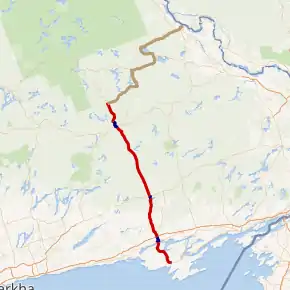 Parting ways with the York River, Highway 62 enters Hastings Highlands and passes through the communities of York River and Birds Creek, which form a continuous stretch of urban development along with the village of Bancroft. The highway then returns to thick forests, although the occasional farm dots the journey north, mostly surrounding the Hickey Settlement. At the Peterson Colonization Road, the highway makes a sharp curve east and enters Maynooth. It ends at the junction with Highway 127, with which it shares a terminus.[1][5] Prior to 1997, Highway 62 continued east and north along what is now known as Hastings Highlands Municipal Road 62, Renfrew County Road 62 and Renfrew County Road 58 via Cobermere, Barry's Bay, Killaloe, Round Lake Centre and Bonnechere to Highway 17 in Pembroke.[11][12]