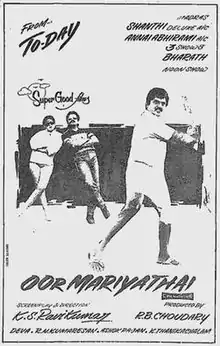 Oor Mariyadhai is a 1992 Indian Tamil-language drama film directed by K. S. Ravikumar. The film stars Sarathkumar, Sasikala, Napoleon and Anand. It revolves around Rathnavelu (Sarathkumar), who is in love with Rasathi (Sasikala) who, however, loves Kannan (Anand). When her mother discovers this fact she gets her forcefully married to Rathnavelu leading to Kannan committing suicide and his brother swearing revenge.