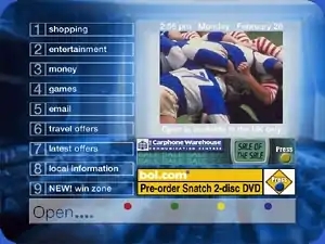 On entering the Open.... platform, users were presented with the Top Level Menu homepage. This consisted of 7 or 8 numbered options (typically shopping, banking, information, email and how to use), and a quarter screen video featuring traditional TV advertising (of the features available through Open....). As users navigated through the various menus, they could eventually enter Open.... service provider portals such as WH Smith shop or Talk21 email. An example can be seen above.