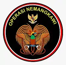 Operation Cartenzs' Peace (Indonesian: Operasi Damai Cartenz),[13] formerly Operation Nemangkawi, is a joint-operation conducted by Indonesian National Armed Forces and Indonesian National Police to curb armed separatist rebels in Papua.[14] According to Papua Regional Police head, Mathius Fakhiri, there are currently six active separatist groups located mainly in Papua highlands.[15] While there are two groups which became less active or retired after Operation Nemangkawi. Tinggi Nambut faction under Goliath Tabuni were beaten in October 2018, and 10 members were subdued by Police. Goliath Tabuni moved to Gome District and presumed retired. Lanny Jaya faction under Purom Wenda became less active after Police operation in Balingga District and its headquarters in Kali Mau.[6] Some members of this group left and "return" to Indonesia.[16]