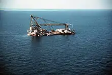 ![]() A U.S. Navy crewman stands atop the cabin of a PB Mark III patrol boat tied up to the oil rig service barge Wimbrown VII in the northern Persian Gulf. From lower to upper right, the barge is armed with a .50-caliber M2 machine gun, an 81 mm Mark 2 mortar, and a 40 mm Mk 19 grenade launcher. | |||||||