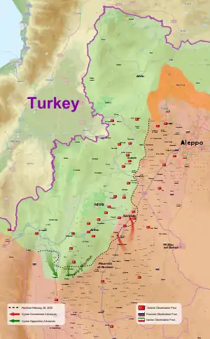 - "Turkish air and ground bombardment kills nearly 50 regime soldiers in Idlib and Aleppo and destroys 13 military vehicles in 24 hours". Syrian Observatory for Human Rights. 29 February 2020.