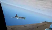 In 2016, Alexander Galkin, the Russia's Southern Military District commander, said Su-25s had flown more than 1,600 sorties and dropped around 6,000 bombs since the beginning of Russia's intervention in September 2015.[62] In September 2017, the Russian Ministry of Defence released a video showing two Su-25s helping to rescue Russian troops encircled by Tahrir al-Sham militants.[63] Two months later, a pair of Su-25s flying near Mayadin, in eastern Syria, was suddenly intercepted by a U.S. F-22 jet which abruptly entered the flight path of the two Russian warplanes and deployed flares and chaff in an attempt to cause the Su-25s to change their heading. The United States claimed the incident was not a provocation but a response to the Russian jets crossing the Euphrates River deconfliction line and not responding to radio calls.[64]