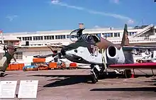 During the War in Abkhazia, the Su-25 was used by the Georgian Air Force, the Abkhazian Air Force, and the Russian Air Force in a series of combat actions in the breakaway province. The Georgian Air Force flew as many as 215 combat missions in the Su-25 during the war.[17] Russian Su-25s flying on the side of Abkhazian separatists performed numerous raids on Georgian positions near the besieged port city of Sukhumi, flying out of an airfield in Gudauta.[18][19] On at least one occasion, a Russian Su-25 bombed a residential district of Sukhumi, killing a civilian and destroying numerous homes and other buildings.[20] During the conflict, the Russian government asserted that Su-25s bombing Georgian positions were not Russian but, in fact, Georgian warplanes with painted Russian insignia, a claim that drew much doubt since many of these Su-25 aircraft were flying uninhibited through Russian airspace.[21] On 6 January 1993, a Georgian Su-25 crashed in Abkhazia province with the pilot ejecting to safety. On 19 March 1993, a Russian Air Force Su-25 piloted by Major Vazlav Shipko was shot down by Georgian air defenses near Sukhumi, however some sources state he was flying a Su-27. On 4 July 1993, a Georgian Su-25 was struck by an Abkhazian surface-to-air missile, forcing the aircraft into the sea off Sukhumi and killing the pilot.[22]