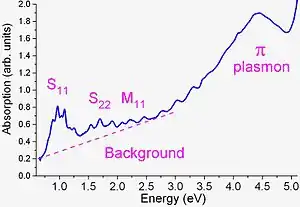Optical absorption in carbon nanotubes differs from absorption in conventional 3D materials by presence of sharp peaks (1D nanotubes) instead of an absorption threshold followed by an absorption increase (most 3D solids). Absorption in nanotubes originates from electronic transitions from the v2 to c2 (energy E22) or v1 to c1 (E11) levels, etc.[6][12] The transitions are relatively sharp and can be used to identify nanotube types. Note that the sharpness deteriorates with increasing energy, and that many nanotubes have very similar E22 or E11 energies, and thus significant overlap occurs in absorption spectra. This overlap is avoided in photoluminescence mapping measurements (see below), which instead of a combination of overlapped transitions identifies individual (E22, E11) pairs.[13][14]