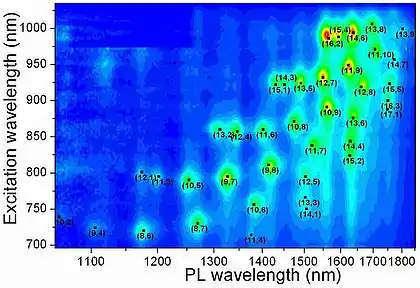 - The spectral range of PL is rather wide. Emission wavelength can vary between 0.8 and 2.1 micrometers depending on the nanotube structure.[13][14]