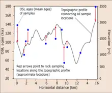 The OSL ages (see diagram), cooling ages, elevation data are plotted against the horizontal distance where samples and elevation data were collected to interpret the exhumation rate of rock or the evolution of the relief system through time.[1] For example, OSL dating has been applied in determined the cooling histories of some rapidly eroding active regions at sub-Quaternary time-scale (i.e. 104 to 105 years). These examples are Whataroa-Perth catchment area in the Southern Alps of New Zealand[1] and Namche Barwa-Gyala Peri dome in eastern Himalaya.[8] In the Namche Barwa-Gyala Peri dome, river erosion was prevalent[8] while glacial erosion was the main active process in the Whataroa-Perth catchment area.[1] In both studies, the rate of exhumation and evolution of the relief systems were estimated by inversion of OSL thermochronological ages.[1][8]