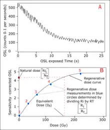 The equivalent dose () is also known as the dose response is determined from the dose response curve (see Plot B).[7] The single-aliquot regenerative (SAR) protocol is a commonly used method for the determination of the equivalent dose.[18] The protocol involves series of laboratory measurement of OSL signal (see Plot A), which is emitted by the aliquot after it has been optically stimulated at a known beta dose within a given time in seconds. The beta-source may be 90Sr/90Y in an automated RisThermal Luminescence Reader . During SAR protocol, the difference in the measurement for quartz and feldspar is mainly on the degree of heat required per time and the source of stimulation.