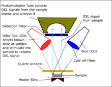 OSL ages are commonly measured using an automated RisThermal Luminescence Reader (e.g. TL-DA-20). It contains an internal beta-source (e.g. 90Sr/90Y) with optical stimulation emitted through laser diodes (LEDs). The reader also has a detection filter for transmission of stimulated luminescence signals. During this measurement, the mineral grain (quartz or feldspar) is glued on a heater strip (stainless-steel discs) using adhesive (commonly silicone spray). The mineral grain is stimulated with the light source.[6] This light is the series of light emitting diode.[6] This bombardment stimulates the electrons, which are trapped and begin to recombine in the crystal.[7] During this process, they give the OSL signal, which is collected or recorded in the ray sensitive photomultiplier tube.[6] The photomultiplier tube converts all the incident photons (i.e. light) to electronic charge. This is the basic principle of how the luminescence (light) emission from the minerals under investigation is measured.