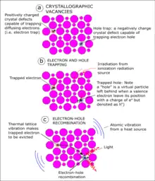 where represents the density of the crystal's recombination centers and r is the distance between the recombination centers and the electron traps. |