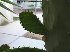 O. ficus-indica is a large, trunk-forming, segmented cactus that may grow to 5–7 m (16–23 ft) with a crown of over 3 m (10 ft) in diameter and a trunk diameter of 1 m (1 yd).[1] Cladodes (large pads) are green to blue-green, bearing few spines up to 2.5 cm (1 in) or may be spineless.[1] Prickly pears typically grow with flat, rounded cladodes (also called platyclades) containing large, smooth, fixed spines and small, hairlike prickles called glochids that readily adhere to skin or hair, then detach from the plant. The flowers are typically large, axillary, solitary, bisexual, and epiperigynous, with a perianth consisting of distinct, spirally arranged tepals and a hypanthium. The stamens are numerous and in spiral or whorled clusters, and the gynoecium has numerous inferior ovaries per carpel. Placentation is parietal, and the fruit is a berry with arillate seeds. Prickly pear species can vary greatly in habit; most are shrubs, but some, such as Opuntia galapageia of the Galápagos, are trees.