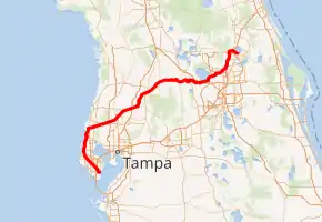 The Atlantic Coast Line merged with its rival, the Seaboard Air Line Railroad, in 1967 to form the Seaboard Coast Line Railroad (SCL). The line remained mostly intact after the merger, though its importance to the combined SCL was diminished.[13] By then, track east of Trilby was freight-only. The Champion continued to run the line from Trilby to St. Petersburg along with a local passenger train and a local freight train after the merger. The Silver Star was also rerouted on to the line from just south of Clearwater (where it joined from the former Seaboard Air Line track) to St. Petersburg.[14] Passenger service north of Clearwater was discontinued in 1971 after the Seaboard Coast Line's passenger service was taken over by Amtrak. Though, Amtrak would continue to run the Silver Star, the Floridian, and the Champion (which was replaced by the Silver Meteor in 1979) from Clearwater to St. Petersburg until 1984, when all passenger service to Pinellas County was discontinued. By 1972, freight service was discontinued on much of the line, and by 1978, tracks were removed between Tarpon Springs and Groveland.[15][16]