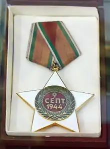 The Order of 9 September 1944 was an Order of Merit of the Kingdom of Bulgaria from 1945 to 1946, and of the People's Republic of Bulgaria from 1946 to 1990. It commemorated the Bulgarian coup d'état of 1944, it came in three classes, had both a civil and military division and was awarded for services connected with the Army revolt of 9 September 1944 and the formation of the People's Republic, to civilians for service to the government and in wartime to officers and leaders of the People's Army for courage and leadership.