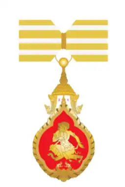 Design: gold breast badge (Obverse: in center, gold figure of the King of the Monkey Army (Hanuman) clutching sword, on red enamel background, surrounded by frieze of small ribbon like protuberances, and at top fixed Royal Lao Crown suspension; Reverse: plain), 34mm across, with rosette on suspension ribbon. Ribbon: 36mm; orange yellow 7mm, white 3mm, orange yellow 6½mm, white 3mm, orange yellow 6½mm, white 3mm orange yellow 7mm; Service bar – with rosette.