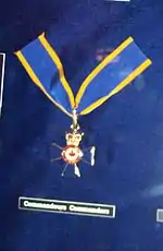 The badges for inductees are of a similar design to the sovereign's badge, though without precious stones, and slight differences for each grade. For Commanders, the emblem is gilt with a red enamel maple leaf in the gold central disk; for Officers, it is gilt with a gold maple leaf; and for Members, both the badge itself and the maple leaf are silver. The reverse bears only a serial number,[2] and all are topped by a St. Edward's Crown,[16] symbolizing that the order is headed by the sovereign. These insignia are worn with the order's ribbon, which is blue with golden edges.[1][2] Commanders wear the badge at the neck while Officers and Members display theirs on the left breast on a medal bar, suspended by, respectively, a bar of gold or silver decorated with a laurel motif. Women in civilian dress may wear their emblems on a ribbon bow pinned at the left chest. The ribbon bar, worn for undress, is the same for each grade, save for a miniature blue cross pattée with a maple leaf, the colour of which matches that on the badge of the grade that the wearer was appointed to;[16] someone who has been promoted within the order may wear on their ribbon bar the pins of all grades that they have occupied. These same miniatures also serves as a lapel pin for civilian wear.[17]