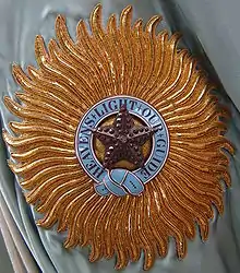 - The star, worn only by Knights Grand Commanders and Knights Commanders, included a sunburst, with twenty-six large rays alternating with twenty-six small rays; it was in gold and circular for Knights Grand Commanders, and in silver and eight-pointed for Knights Commanders. In the centre of the sunburst was a light blue ring bearing the motto of the Order. Within the ribbon was a five-pointed star, decorated with diamonds for Knights Grand Commanders.