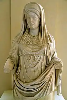 The title sacerdos was often specified in relation to a deity or temple,[23][24] such as a sacerdos Cereris or Cerealis, "priestess of Ceres", an office never held by men.[25] Female sacerdotes played a leading role in the sanctuaries of Ceres and Proserpina in Rome and throughout Italy that observed so-called "Greek rite" (ritus graecus). This form of worship had spread from Sicily under Greek influence, and the Aventine cult of Ceres in Rome was headed by male priests.[26] Only women celebrated the rites of the Bona Dea ("Good Goddess"), for whom sacerdotes are recorded.[27] The Temple of Ceres in Rome was surved by the Priestess of Ceres, Sacerdos Cereris, and the Temple of Bona Dea by the Priestess of Bona Dea, Sacerdos Bonae Deae. Other Priestesses were the Sacerdos Liberi, Sacerdos Fortunae Muliebris and the Sacerdos Matris Deum Magnae Idaeae; sacerdos also served as priestesses of the Imperial cult.
