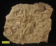 Though less famous than the Cambrian explosion, the Ordovician radiation (also known as the Great Ordovician Biodiversification Event)[17] was no less remarkable; marine faunal genera increased fourfold, resulting in 12% of all known Phanerozoic marine fauna.[44] Another change in the fauna was the strong increase in filter-feeding organisms.[45] The trilobite, inarticulate brachiopod, archaeocyathid, and eocrinoid faunas of the Cambrian were succeeded by those that dominated the rest of the Paleozoic, such as articulate brachiopods, cephalopods, and crinoids. Articulate brachiopods, in particular, largely replaced trilobites in shelf communities.[46] Their success epitomizes the greatly increased diversity of carbonate shell-secreting organisms in the Ordovician compared to the Cambrian.[46]