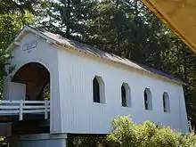 The Ritner Creek Bridge was the last covered bridge on a state highway in Oregon. It was on OR 223 between Pedee and Kings Valley, about 15 miles south of Dallas, or 10 miles north of the junction with US 20 in Wren. Built in 1927, the bridge was replaced in 1976 and relocated just downstream and parallel to the new span.[1]