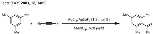 - Hydroarylation: basically a Friedel-Crafts reaction using metal-alkyne complexes. Example, the reaction of mesitylene with phenylacetylene:[31]