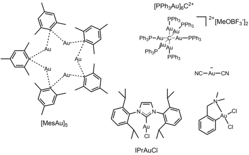 Organogold chemistry is the study of compounds containing gold–carbon bonds. They are studied in academic research, but have not received widespread use otherwise. The dominant oxidation states for organogold compounds are I with coordination number 2 and a linear molecular geometry and III with CN = 4 and a square planar molecular geometry.[1][2][3] The first organogold compound discovered was gold(I) carbide Au2C2, which was first prepared in 1900.[4]