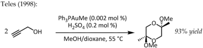 In 1991, Utimoto reacted gold(III) (NaAuCl4) with alkynes and water.[19] Teles identified a major drawback of this method as Au(III) was rapidly reduced to catalytically dead metallic gold and in 1998 returned to the theme of ligand supported Au(I) for the same transformation:[20]