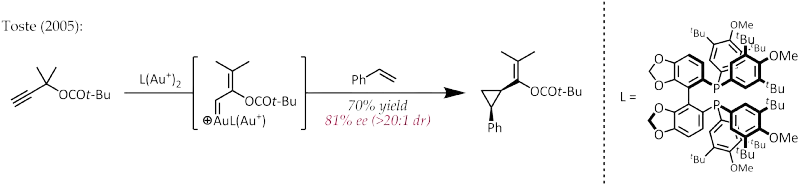 Relativistic effects are significant in organogold chemistry due to the large nuclear charge of the metal (Z = 79). As a consequence of relativistically expanded 5d orbitals, the LAu fragment can stabilize a neighboring carbocation via electron donation into the empty p-type orbital. Thus, in addition to their expected carbocation-like reactivity, these cations also exhibit significant carbene character, a property that has been exploited in catalytic transformations such as cyclopropanation and C-H insertion.[23] Propargyl esters can serve as precursors for cationic gold-vinylcarbene intermediates, which can react with alkenes in a concerted manner to afford the cyclopropanation product. The use of a chiral ligand ((R)-DTBM-SEGPHOS) resulted in good to excellent levels of enantioselectivity.[24]