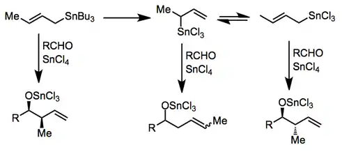 In the presence of certain Lewis acids, transmetalation may occur before addition. Complex reaction mixtures may result if transmetalation is not complete or if an equilibrium between allylic isomers exists. Tin(IV) chloride[7] and indium(III) chloride[8] have been employed for useful reactions in this mode.