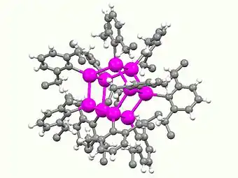 Compounds of Sn(I) are rare and only observed with very bulky ligands. One prominent family of cages is accessed by pyrolysis of the 2,6-diethylphenyl-substituted tristannylene [Sn(C6H3-2,6-Et2)2]3, which affords the cubane-type cluster and a prismane. These cages contain Sn(I) and have the formula [Sn(C6H3-2,6-Et2)]n where n = 8, 10.[12] A stannyne contains a carbon to tin triple bond and a distannyne a triple bond between two tin atoms (RSnSnR). Distannynes only exist for extremely bulky substituents. Unlike alkynes, the C-Sn-Sn-C core of these distannynes are nonlinear, although they are planar. The Sn-Sn distance is 3.066(1) Å, and the Sn-Sn-C angles are 99.25(14)°. Such compounds are prepared by reduction of bulky aryltin(II) halides.[13]