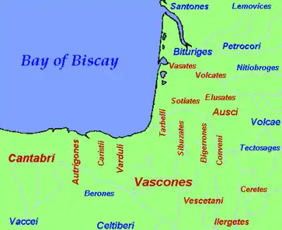 Strabo in the 1st century AD reported that the Ouaskonous (Vascones) inhabited the area around the town of Pompelo, and the coastal town of Oeaso (Οἰασών) in Hispania. He also mentioned other tribes between them and the Cantabri: the Varduli, Caristii, and Autrigones.[35] About a century later, Ptolemy also listed the coastal Oeasso (Οἰασσώ) beside the Pyrénées to the Vascones, together with 15 inland towns, including Pompelon.[36] Pompelo/Pompelon is easily identified as modern-day Pamplona, Navarre. The border port of Irún, where a Roman harbour and other remains have been uncovered, is the accepted identification of the coastal town mentioned by Strabo and Ptolemy.[37][38][39] Three inscriptions in an early form of Basque found in eastern Navarre can be associated with the Vascones.[40]