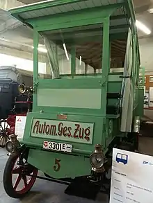 In August 1904, an automobile course was set up with Orion buses from the Aktiengesellschaft für Automobilverkehr im Kanton Zug from Zug via Hinterburg to Menzingen; An automobile course in the Ägerital was offered, which on 1 November 1905 took over also the post courses. The routes were extended to Zug - Baar - Menzingen and to Zug - Unterägeri - Oberägeri. However, in 1913, the tram canceled the automobile courses because the Orion buses were not yet reliable and with their solid rubber tires on the unpaved road not comfortable - the streetcar promised a quality increase. An Orion bus was stored in the Swiss Museum of Transport, it was restored by the Orion Club and since 1 April 2000 it has been an exhibit in the Zuger Depot Technikgeschichte.