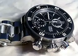 Since the turn of the millennium, the company has concentrated on the worlds of Diving, Culture, Aviation and Motor Sports.[18] Since 2002, the Red Rotor has served as Oris's registered trademark and distinguishing feature. In 2004, the Quick Lock Crown system was developed, which only requires a single clockwise turn of 120 degrees to secure it in place. In 2009, Oris introduced the Rotation Safety System, a device that locks the uni-directional rotating bezel of a diving watch into place, preventing accidental adjustment under water. Oris patented the Oris Aquis Depth Gauge, its first mechanical depth gauge, in 2013. It allows water into a channel via a small hole at 12 o’clock. Water enters the hole under pressure, creating a watermark that corresponds to a depth gauge. In 2014, Oris celebrated 110 years of watchmaking with its first in-house-developed calibre for 35 years. Calibre 110 was a hand-wound movement that featured a 10-day power reserve and a patented non-linear power reserve indicator.[19] In 2020, Oris introduced the Calibre 400, an in-house movement which is anti-magnetic up to 2250 gauss, has a 5-day power reserve (120 hours), a recommended 10 year service interval and comes with a 10 year warranty. [20]