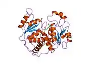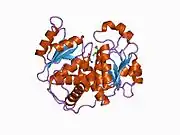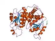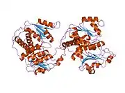 Ornithine transcarbamylase (OTC) (also called ornithine carbamoyltransferase) is an enzyme (EC 2.1.3.3) that catalyzes the reaction between carbamoyl phosphate (CP) and ornithine (Orn) to form citrulline (Cit) and phosphate (Pi). There are two classes of OTC: anabolic and catabolic. This article focuses on anabolic OTC. Anabolic OTC facilitates the sixth step in the biosynthesis of the amino acid arginine in prokaryotes.[5] In contrast, mammalian OTC plays an essential role in the urea cycle, the purpose of which is to capture toxic ammonia and transform it into urea, a less toxic nitrogen source, for excretion.