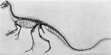 Ornitholestes was the first theropod to be discovered in the 1900s.[2] The holotype skeleton (AMNH 619) was excavated in July 1900 in the Bone Cabin Quarry in Wyoming by an American Museum of Natural History expedition by Peter C. Kaisen, Paul Miller and Frederic Brewster Loomis.[3][4] It represents a partial skeleton with skull, including numerous elements of the vertebral column, the forelimbs, pelvis and hindlimbs. Henry Fairfield Osborn named and scientifically described the specimen in 1903.[5] The genus name Ornitholestes, initially suggested by Theodore Gill, means "bird robber" and is derived from the Greek ὄρνις/ornis, ornithos ("bird") and λῃστήσ/lestes ("robber").[6] The species name (O. hermanni) honors Adam Hermann, the head preparator at the Museum, who directed the restoration and mounting of the skeleton.[3]
