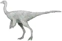 Unambiguous evidence of feathers is known from Ornithomimus edmontonicus, of which there are multiple specimens preserving feather traces.[10] Deinocheirus and Pelecanimimus have been speculated to be feathered as well, the former due to the presence of a pygostyle,[11] and the later due to possible impressions (otherwise taken to be collagen fibers). There is a debate on whether ornithomimids possessed the pennaceous feathers seen in Pennaraptora.[12] Otherwise, a very ostrich-like plumage and feather range is known in one specimen of Ornithomimus.[13]