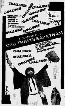 Oru Thayin Sabhatham (transl. A mother's vow) is a 1987 Indian Tamil-language legal drama film[1] written, directed, composed and produced by T. Rajendar. He himself appeared in the lead role with Srividya, whilst the film featured an extensive cast, which also featured Rajendar's son Silambarasan. The film released on 14 April 1987. It is a remake of the 1985 Hindi film Meri Jung.[2]