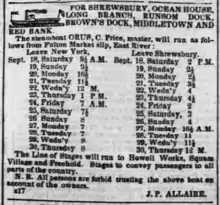Beginning in 1842 Orus made one round trip a day between the Fulton Market wharf[4] in lower Manhattan and Red Bank, New Jersey. She stopped at Shrewsbury, Long Branch, Ocean House, Port Washington, and Middletown.[5] The fare was 50 cents in 1843, but was raised to $1 in 1844.[6][7] Orus spent much of her time during her New Jersey service under the command of Captain John Edward Allaire, J. P. Allaire's nephew.[8] Stage coach lines were synchronized with Orus' schedule to carry passengers between Red Bank and Upper Squankum (now Farmingdale), Freehold, and the Howell Works.[9][10]