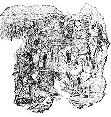 The fragments of the tapestry feature a scene containing two black birds hovering over a horse, possibly originally leading a wagon (as a part of a procession of horse-led wagons on the tapestry). Anne Stine Ingstad interprets these birds as Huginn and Muninn flying over a covered cart containing an image of Odin with a horned helmet, drawing comparison with the images of Nerthus attested by Tacitus in 1AD.[1]