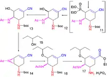 The current production method includes two reaction steps with potentially hazardous azides. A reported azide-free Roche synthesis of tamiflu is summarised graphically below:[7]