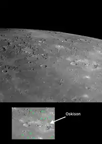 ![]() Oskison crater. The lower image highlights some of its secondary crater chains. | |