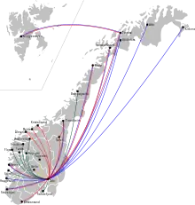 Following Norway joining the European Economic Area (EEA), the airline industry was deregulated, allowing any airline from any EEA member country to make domestic or international flights to Norway. However, by 1994 there was no available slots at Fornebu during the morning and evening rush hours, limiting the number of new routes that could be established. After the deregulation, Fornebu could not offer slots to new airlines, and SAS and Braathens could not establish as many competing routes as they wanted to.[14] However, domestic services were provided by both SAS and Braathens SAFE to Stavanger, Bergen, Trondheim, Bodø, Harstad/Narvik, Tromsø and Longyearbyen. The remaining domestic airports were only served by the incumbent.[15] In addition, Teddy Air offered services to Fagernes.[16]