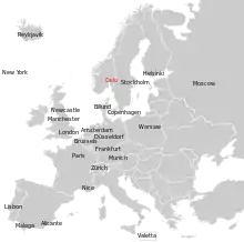 International services were provided by 21 airlines to 28 destinations. SAS had international flights to Amsterdam, Brussels, Billund, Copenhagen, Düsseldorf, Frankfurt, Helsinki, London-Heathrow, Manchester, Munich, New York, Nice, Paris, Stockholm and Zurich.[11] Braathens SAFE offered international services to Alicante, Billund, London-Gatwick, Málaga, Newcastle and Stockholm.[12] Lufthansa offered flights to Düsseldorf, Frankfurt, Hamburg and Munich.[11] Other foreign airlines that provided services to their main hubs included Aeroflot (Moscow-Sheremetyevo), Air France (Paris-Charles de Gaulle), Air Malta (Valletta), TAP Air Portugal (Lisbon), AirUK (London-Stansted), Alitalia (Milan), British Airways (London-Heathrow), Dan-Air (London-Gatwick), Delta Air Lines (New York-JFK), Iberia (Madrid) and (Barcelona), Icelandair (Reykjavík), KLM (Amsterdam), LOT Polish Airlines (Warsaw), Pan Am (New York-JFK) and Sabena (Brussels).[17][18]