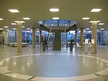 At the time of closing, the airport consisted of a single terminal with three satellites: two domestic and one international. The service building had three stories, one for arrival, one for departure and one for administration. Airplane capacity at the airport was 20 craft;[1] five planes parked at the international terminal could be served with jetbridges, while passengers had to walk outdoors to get to domestic planes. The airport terminals were 36,000 square metres (390,000 sq ft), of which 16,000 square metres (170,000 sq ft) were for the public.[2] In the main hall of the terminal were two murals made by Kai Fjell, both which have been preserved. The largest was the 310-square-metre (3,300 sq ft) Arrival and Departure which was completed in 1968 and covered three stories.[3]