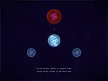 The aim of the game is to propel oneself, a single-celled organism ("Mote"), into other smaller motes to absorb them. Colliding with a mote larger than the player will cause the player to be absorbed, resulting in a game over. Motes smaller than the player are blue, while motes bigger than the player are red. Changing course is done by expelling mass. Due to conservation of momentum, this results in the player's mote moving away from the expelled mass, but also in one's own mote shrinking.