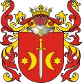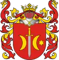 Ostoja is a Polish coat of arms that probably originated from Sarmatian Tamga[1][2] and refer to Royal Sarmatians using Draco standard. Following the end of the Roman Empire, in the Middle Ages it was used by Ostoja family in Lesser Poland and later also in Kujavia, Mazowsze and Greater Poland.[3] It is a coat of arms of noble families that fought in the same military unit using battle cry Hostoja or Ostoja, and that applied their ancient heritage on the Coat of Arms, forming a Clan of knights. Later, when the Clan expanded their territory to Pomerania, Prussia, Slovakia, Hungary and Romania they also adopted a few noble families of Ruthenian origin that in 14-15th century settled down in Lithuania, Belarus and Ukraine, finally turning into the Clan of Ostoja. As different lines of the clan formed surnames after their properties and adding the adoptions, Ostoja was also recognized as CoA of several families that was not necessary connected to the original Clan, forming Heraldic clan.[4][5][6]